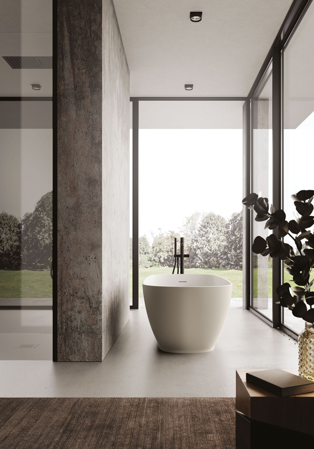 Oval est une baignoire à pose libre aux douces formes ovales. Elle est disponible en deux longueurs et profondeurs (Oval et Oval mini) pour s’adapter aux petites salles de bains et peut avoir des panneaux de finition. Elle est fabriquée en Aquatek dans la finition Bianco mat, avec la possibilité d’être colorée (extérieurement seulement ou aussi intérieurement) dans n’importe quelle couleur laquée mate des nuanciers Ideagroup, RAL ou NCS. Le trop plein est intégré dans la baignoire. Finition cache-bonde en teinte.