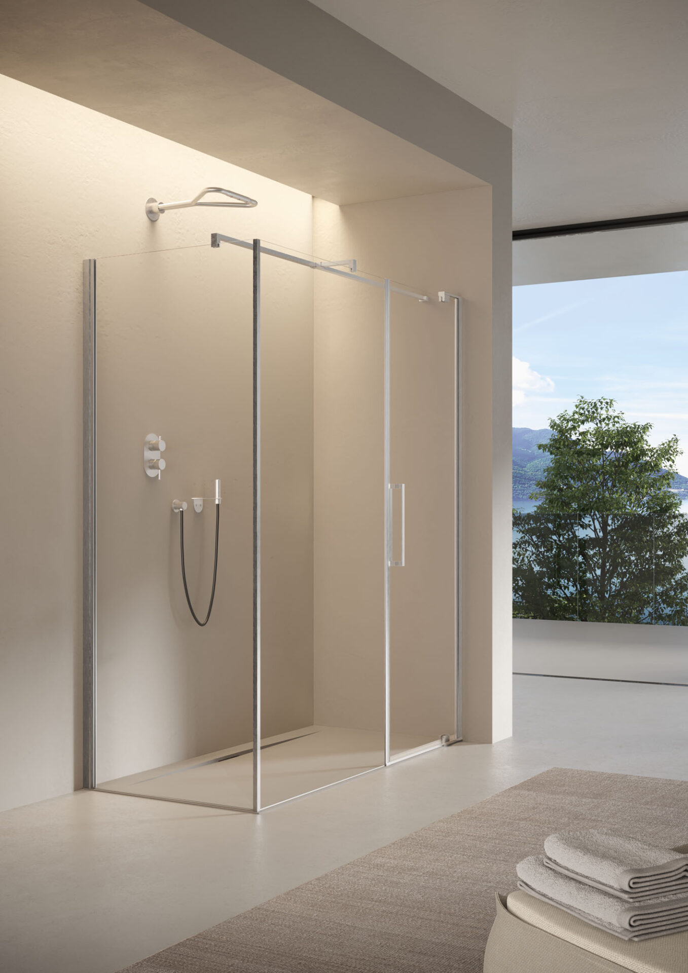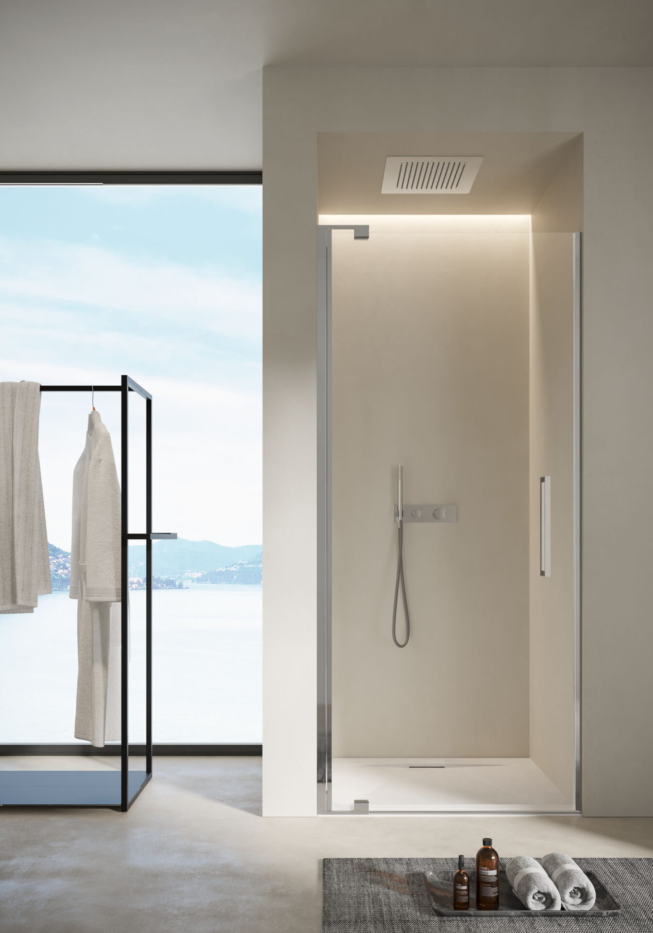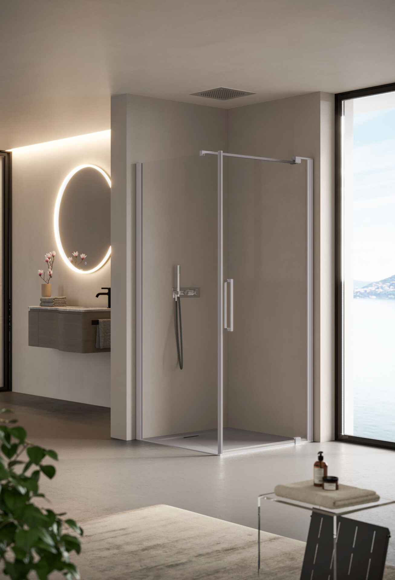 Slim : la cabine de douche sans cadre aux formes essentielles, avec porte pivotante et à double battant, disponible dans la version en niche, d’angle et sur demi-mur. Les poignées sont double face. Les charnières pivotantes renforcent la sensation de légèreté et facilitent les réglages.