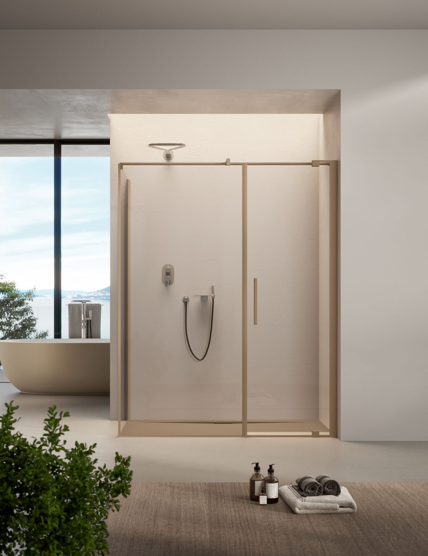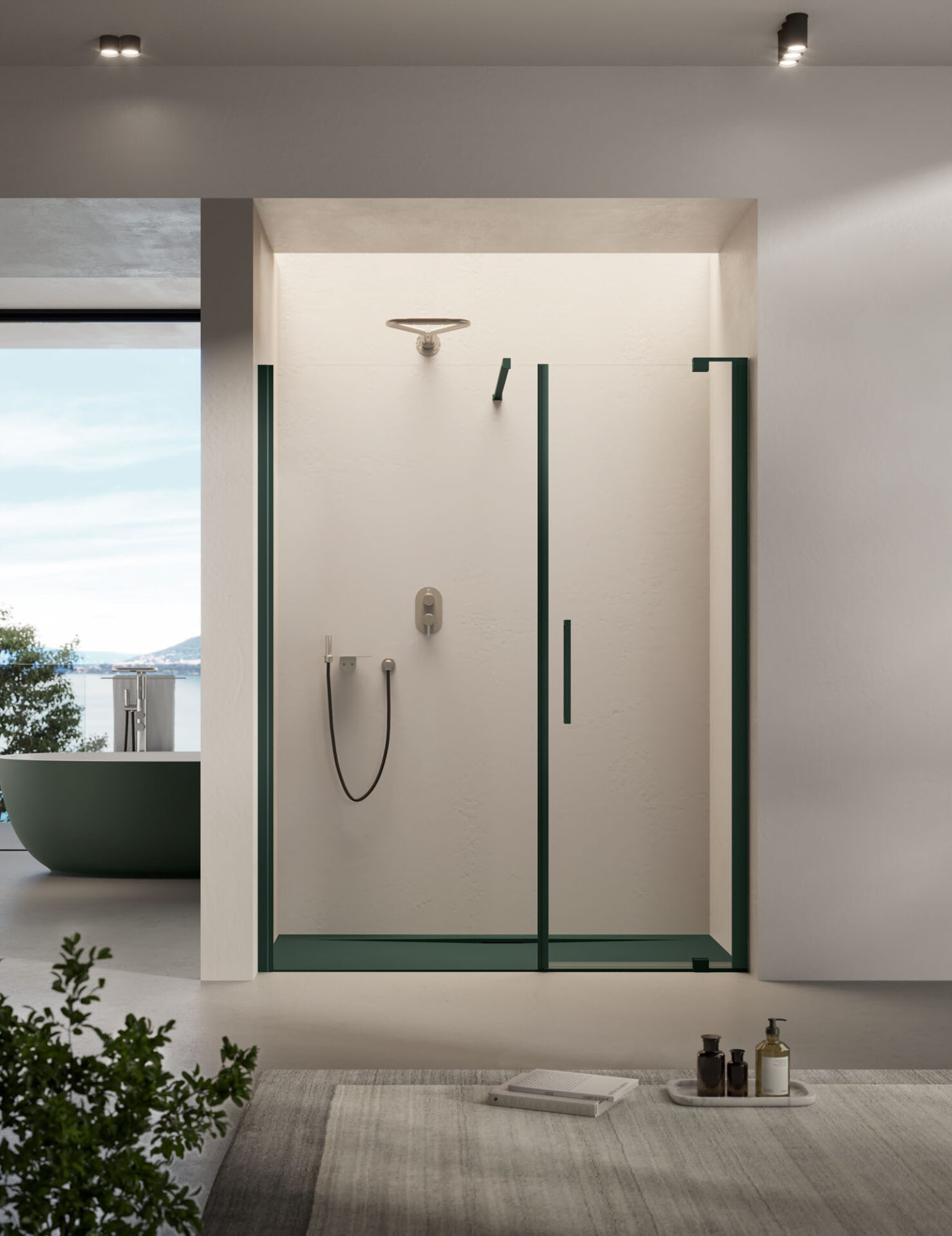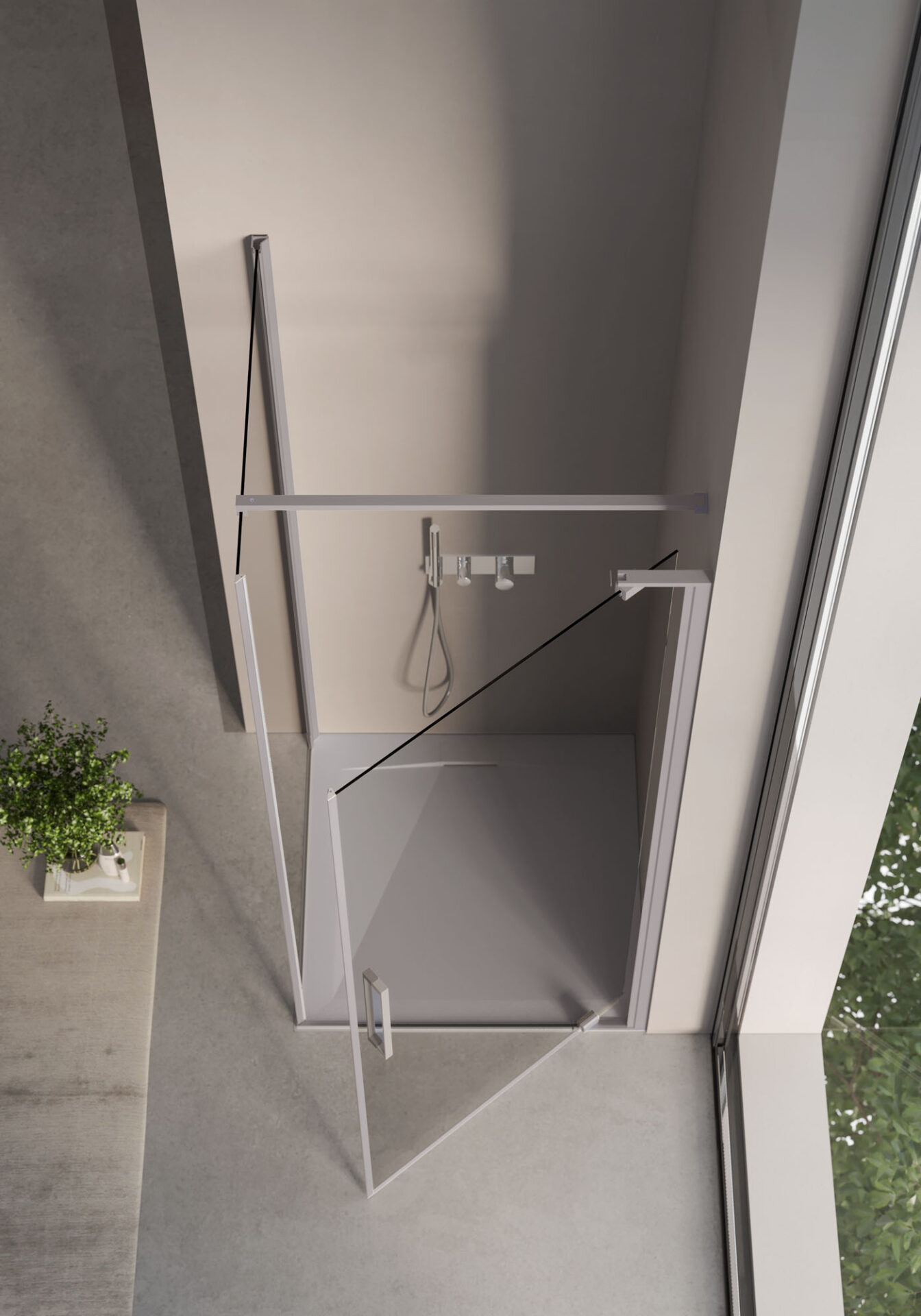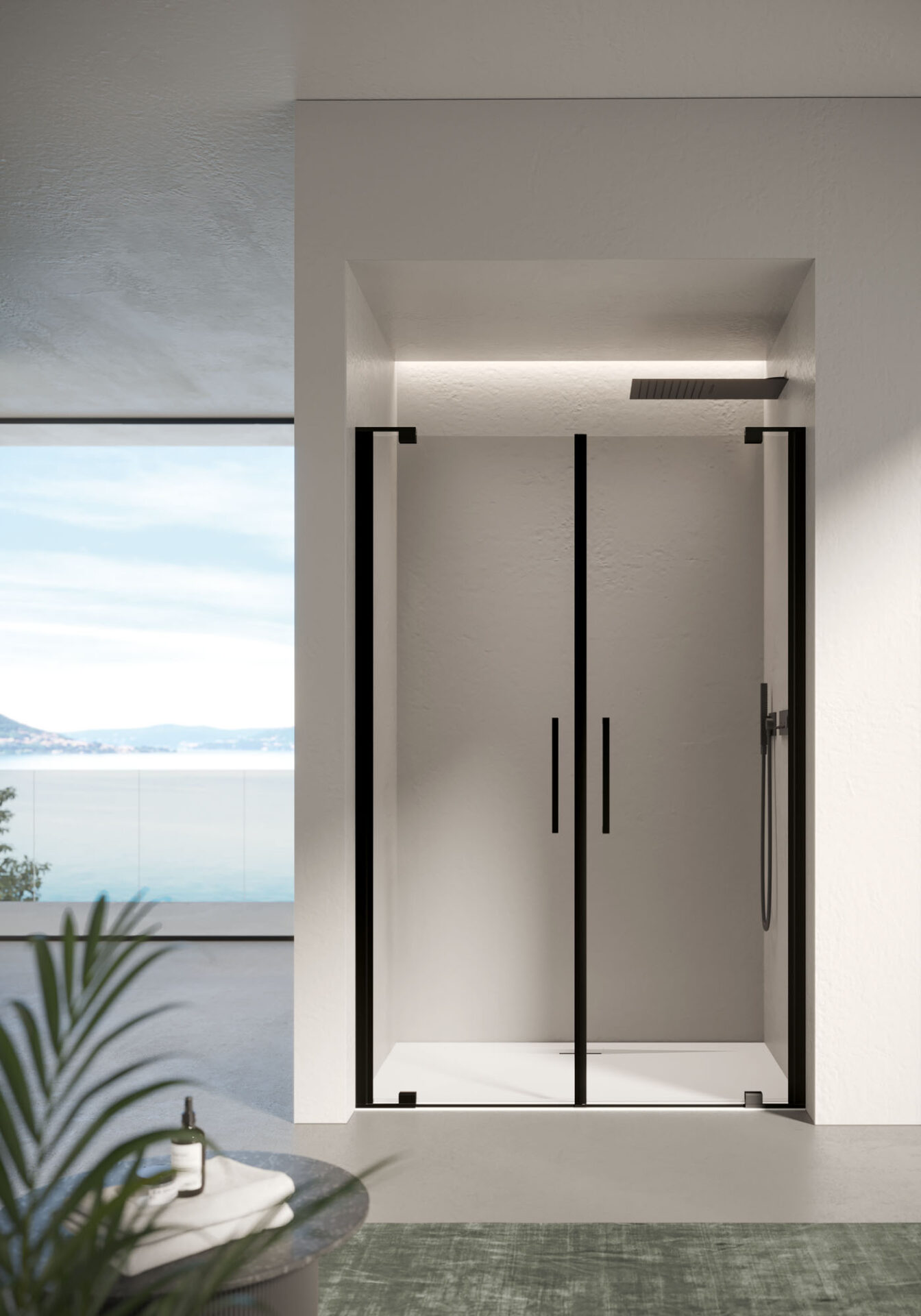Slim : la cabine de douche sans cadre aux formes essentielles, avec porte pivotante et à double battant, disponible dans la version en niche, d’angle et sur demi-mur. Les poignées sont double face. Les charnières pivotantes renforcent la sensation de légèreté et facilitent les réglages.