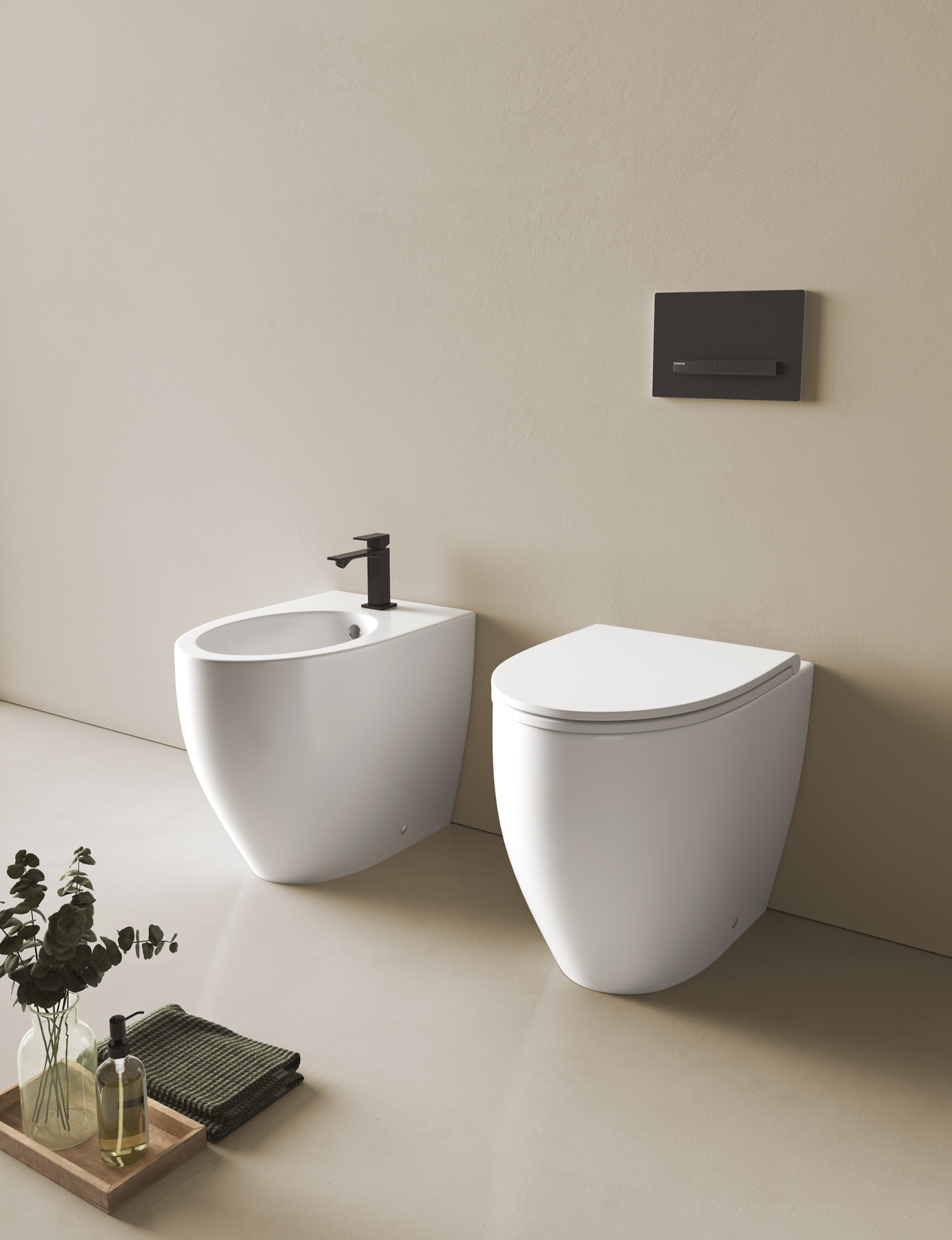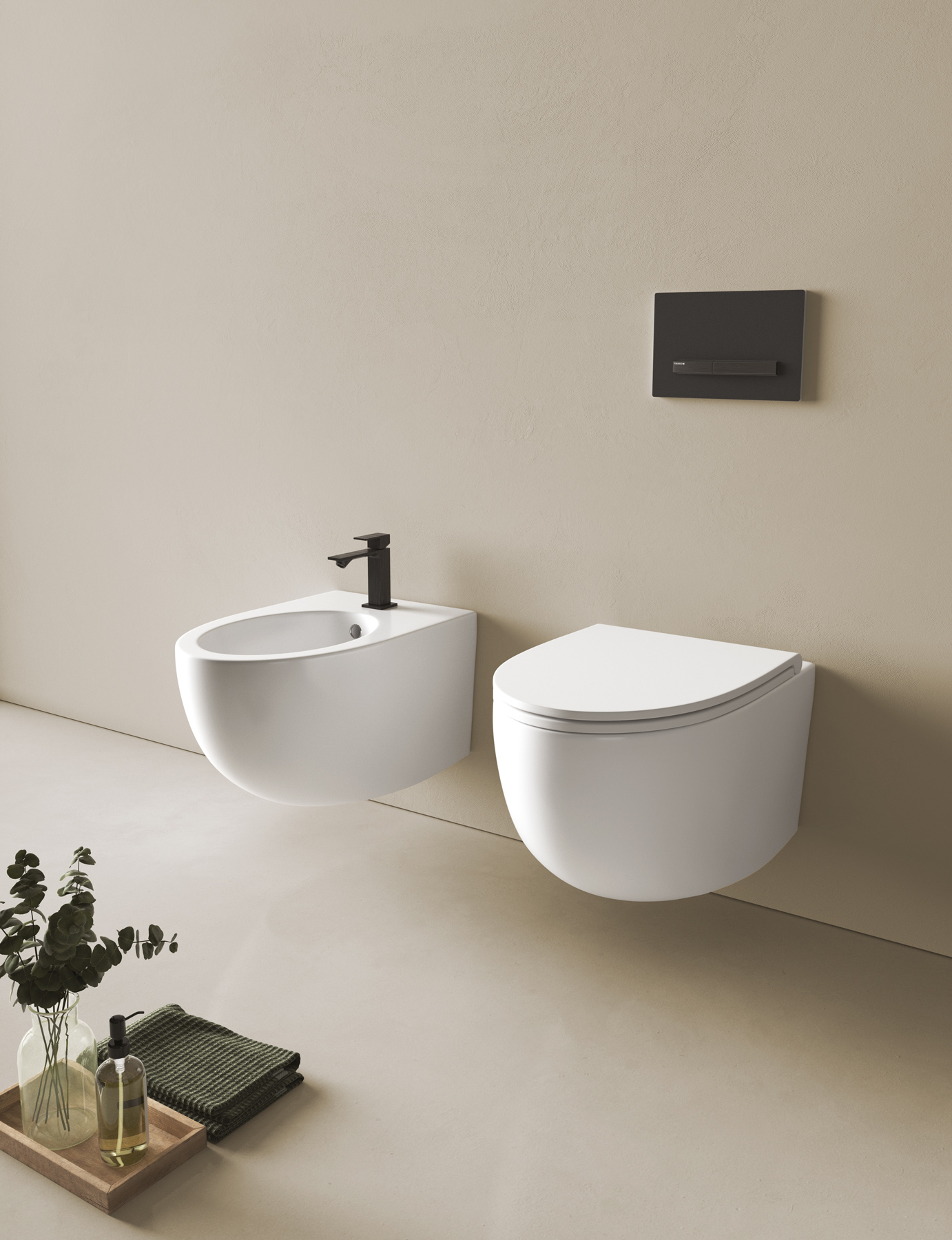 De forme compacte ou sinueuse, les équipements sanitaires de la collection Bob, en version suspendue ou à poser au sol, sont réalisés en céramique Bianco mat.