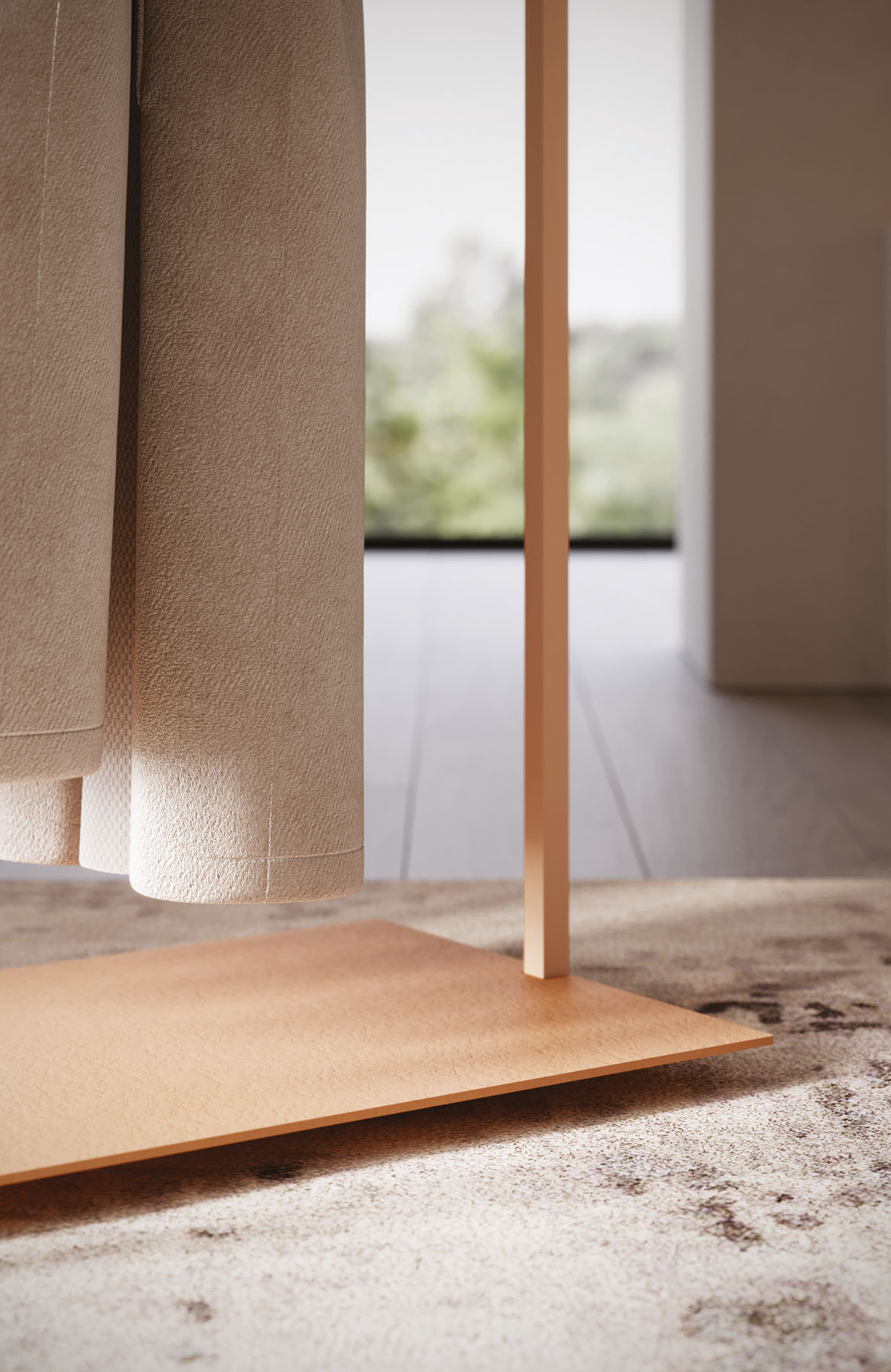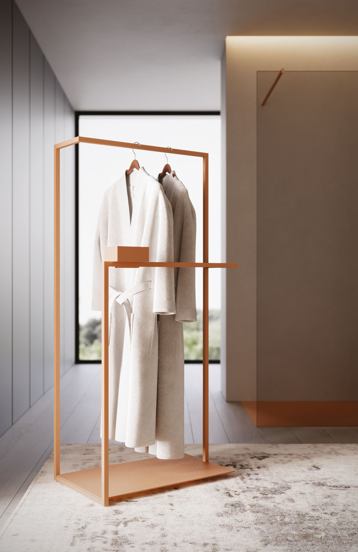 Atollo est un porte-peignoirs d’intérieur, muni d’un pratique vide-poche et d’une solide étagère inférieure en Laminam®, ou en métal peint de la même couleur que la structure ou avec la même texture que les receveurs de douche.