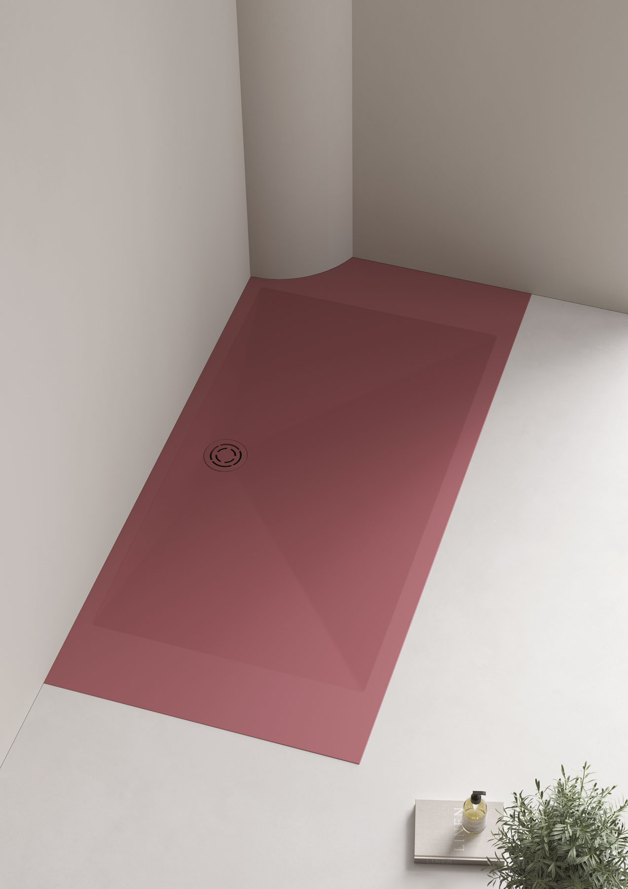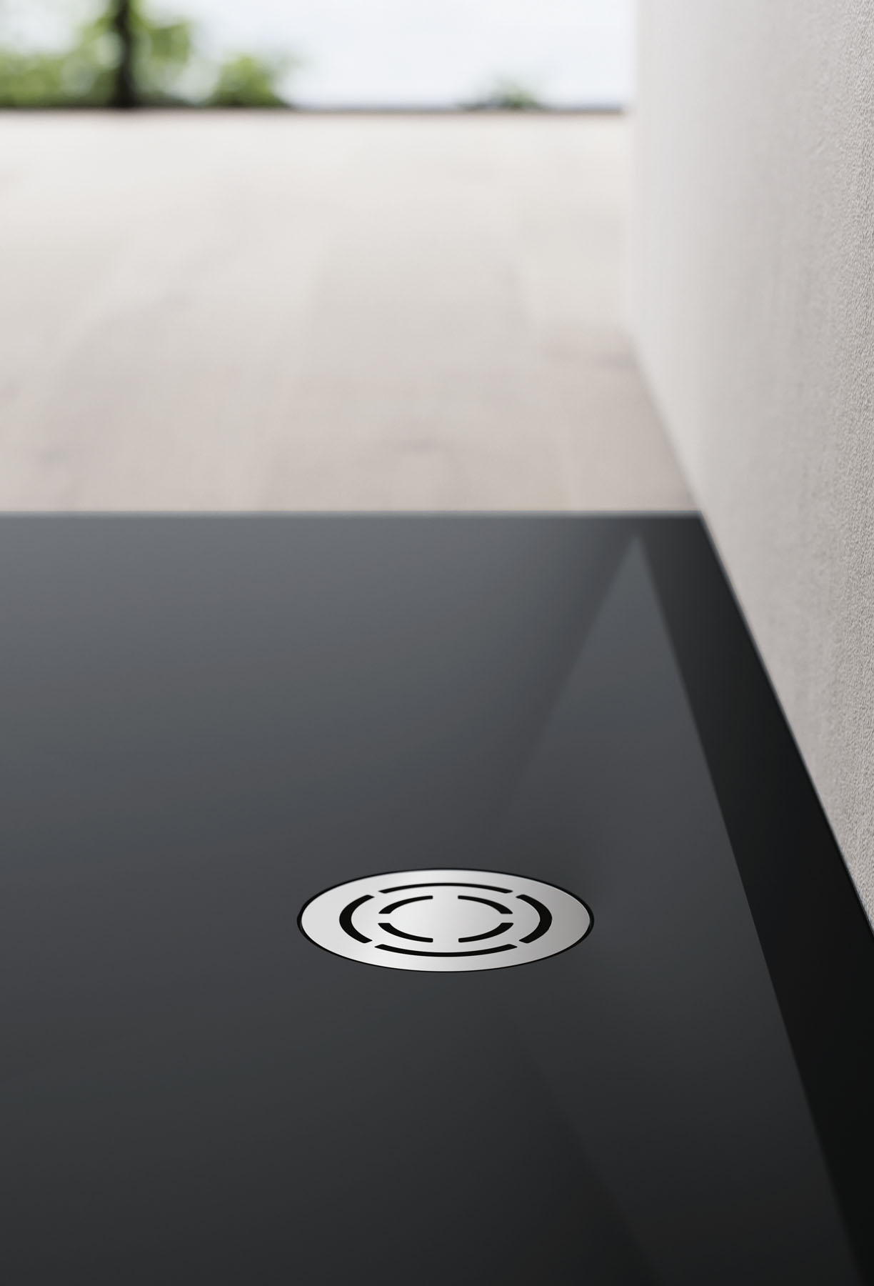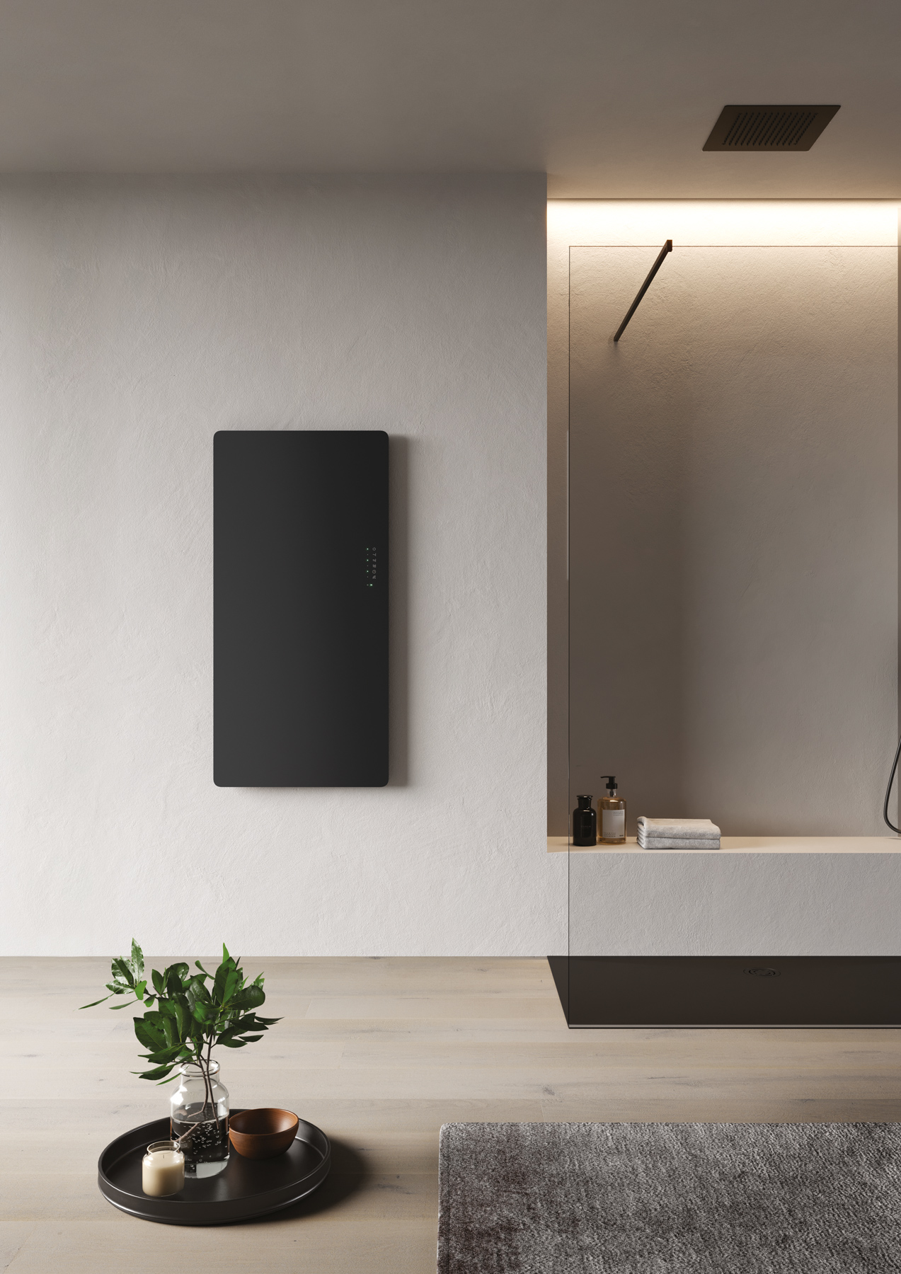 Une approche sur mesure caractérise le nouveau receveur de douche Mohair, disponible en deux matériaux : Aquatek blanc ou Aquagel couleur mate. La bonde de vidage ronde, disponible en acier dans la finition Inox Spazzolato ou dans la finition assortie, est placée sur le côté long. À associer avec le radiateur électrique Helios dans la même texture.